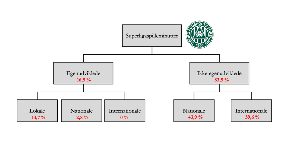 Hele 83,5 % af spilletiden hos Viborg FF varetages af spillere, der ikke er egenudviklede. Klubben benytter en næsten ligelig fordeling mellem to hovedgrupper for at sikre kvaliteten på førsteholdet: